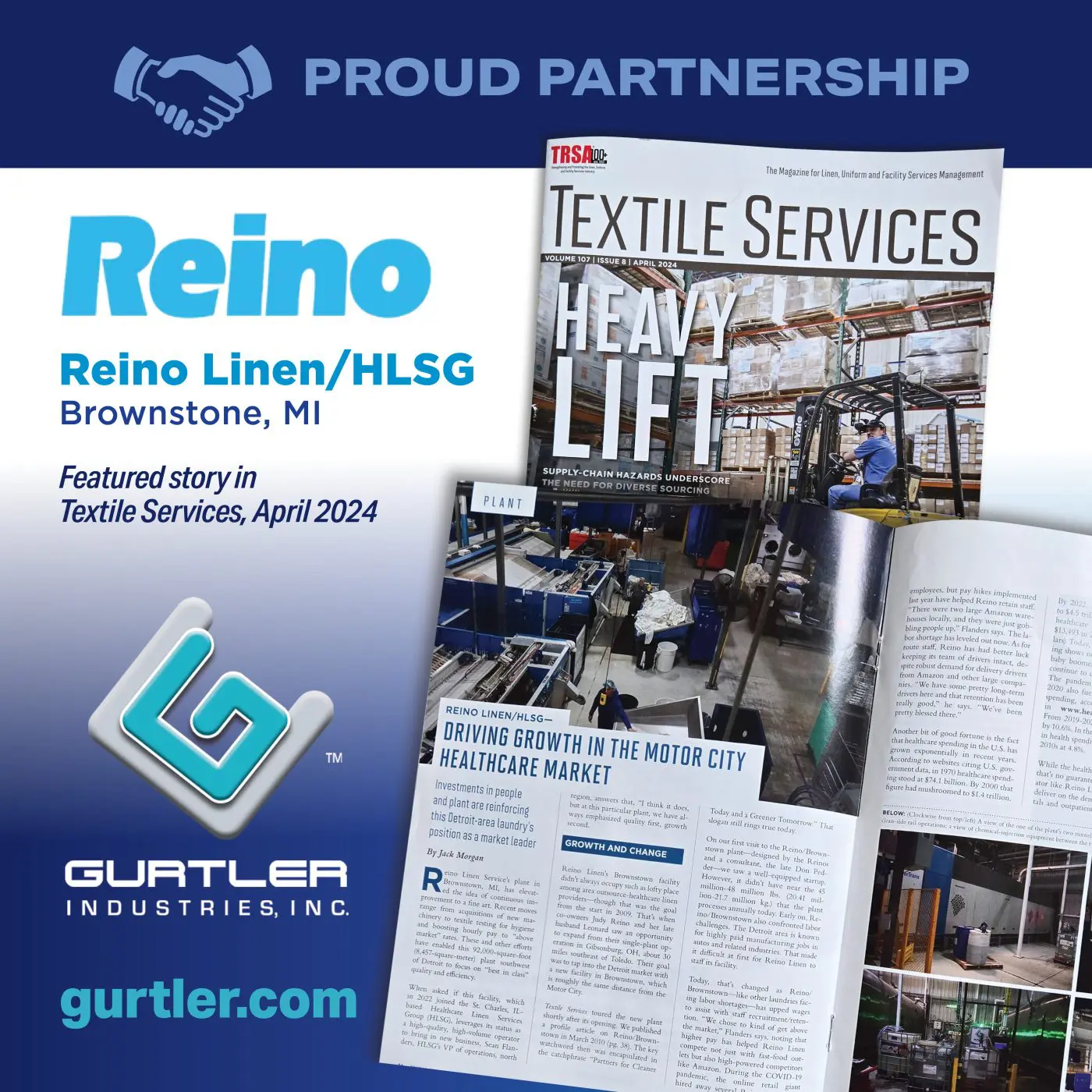 Textile Services spotlighted Reino Linen, an HLSG facility in Brownstown, MI, for its advanced use of Gurtler solutions. The plant utilizes Gurtler specialty chemicals, dispensing systems, and the GLSS tracking program, which provides real-time productivity data. This innovation supports staff efficiency, goal tracking, and seamless integration with ABS route-accounting.