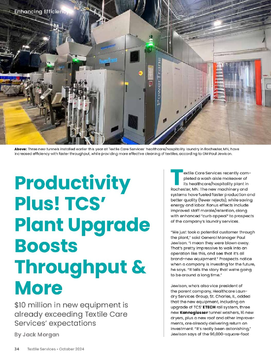 Textile Care Services (TCS) in Rochester, MN, recently unveiled a $10 million plant makeover, highlighted in Textile Services magazine. With advanced Gurtler systems including VisโขTex UV technology and GLSS monitoring, TCS boosts efficiency, sustainability, and hygiene. TCS proudly serves healthcare and hospitality clients, including Rochesterโs Mayo Clinic system.