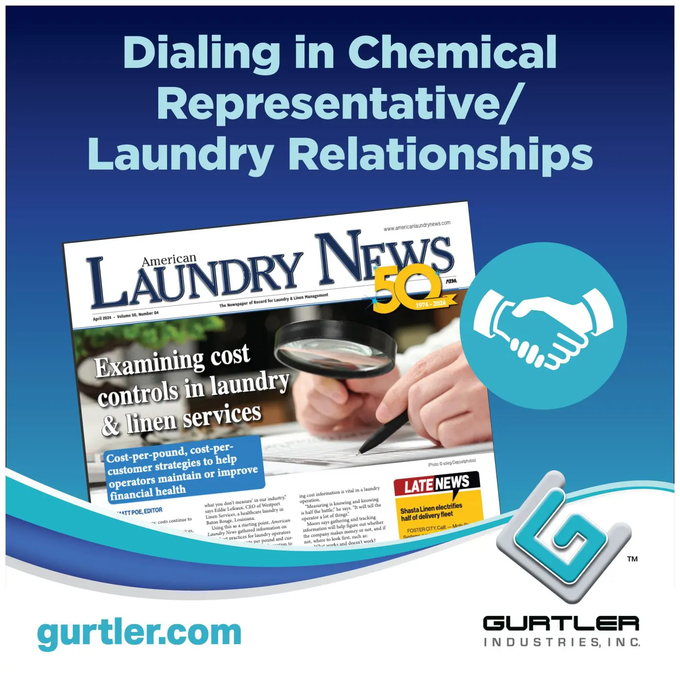 The April 2024 issue of American Laundry News featured insights from Gurtlerโs Steve Tinker on the importance of strong chemical representativeโlaundry relationships. Tinker emphasized that skilled reps act as consultantsโoptimizing wash formulas, monitoring operations, and supporting management goalsโwhile communication, innovation, and efficiency remain central to building long-term, successful partnerships.