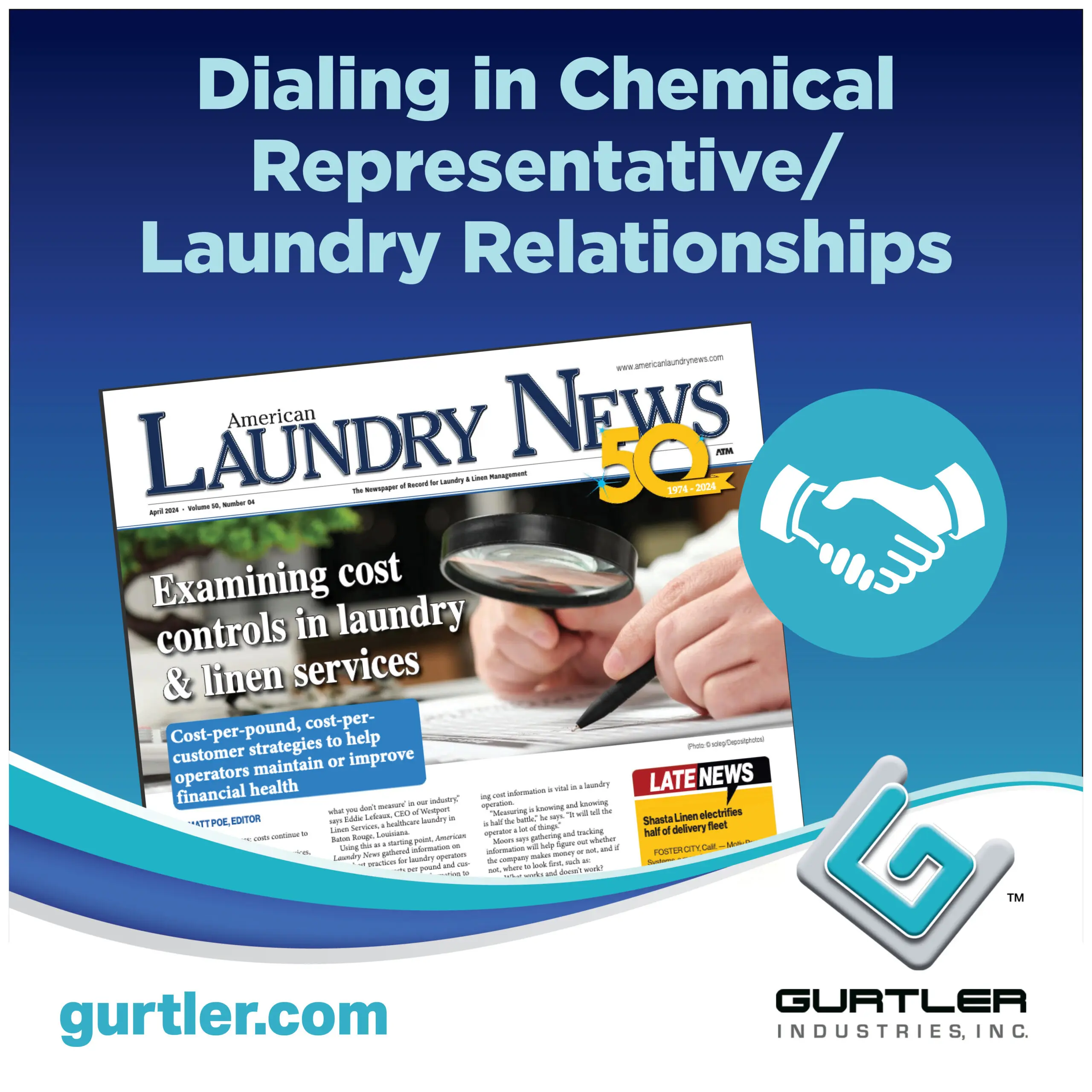 The April 2024 edition of American Laundry News features the article โDialing in Chemical Representative/Laundry Relationshipsโ by Matt Poe, Editor. The article focuses on the key factor of the successful processing of goods is relationships, and one of the most important relationships is that of the chemical representative and the laundry operator.
