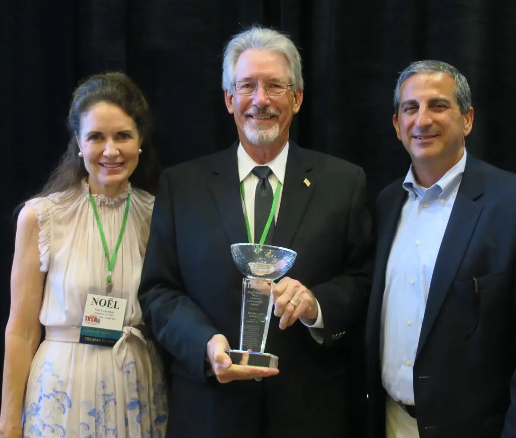 Steve Tinker (center) presented with the Lifetime Achievement Award by TRSA Chair Noël Hammer Richardson (left) and TRSA President and CEO Joseph Ricci (right).