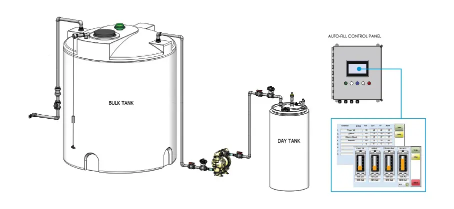 Automatic transfer from bulk to day tanks. Never experience a chemical spill with our triple redundancy overflow monitors: (1) Sonic Sensor, (2) back-up level switch, and (3) programmable maximum pump timer. -