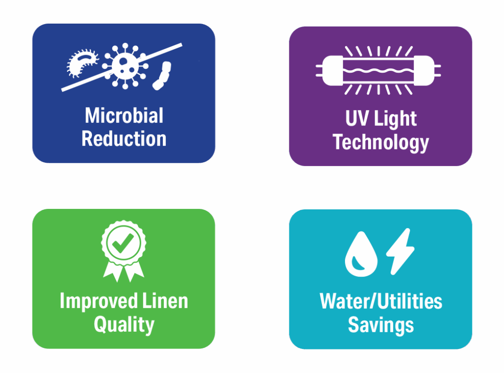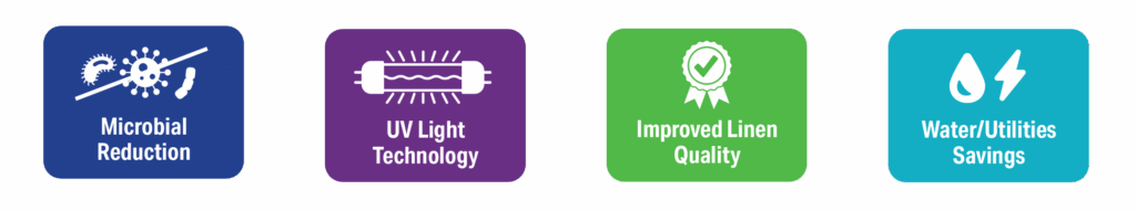 The innovative, patented, EPA-registered Vis•Tex Tunnel UV System utilizes the latest UV technology to capture and treat press water, reducing the need for fresh water and energy while improving linen quality and reducing rewash. UV technology combined with advanced oxidation technology provides extraordinary microbial decontamination, assuring hygienically clean textiles.