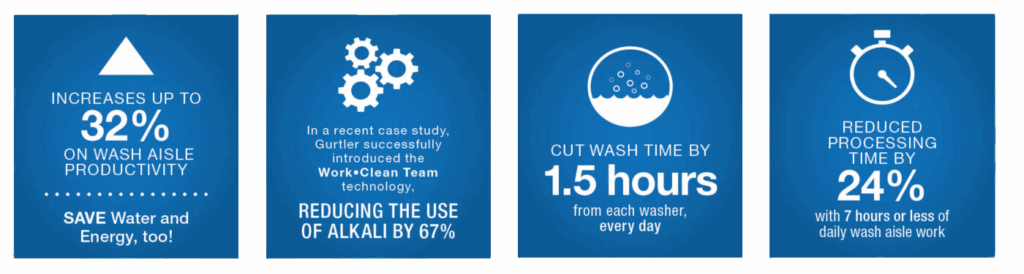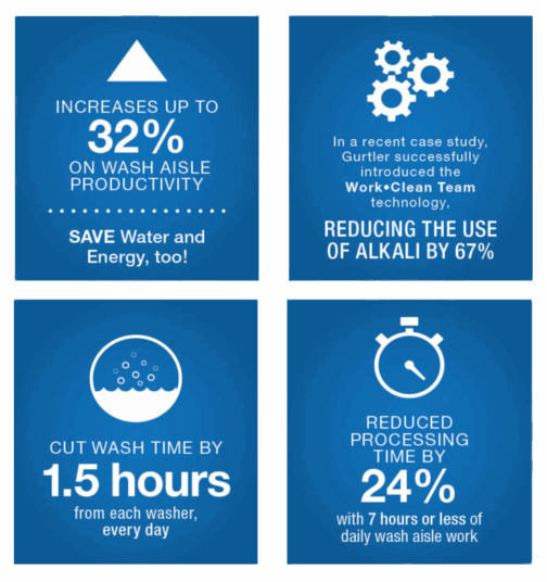 The Work•Clean Team’s high detergent/low alkaline technology delivers superior results without the use of harsh caustic chemicals. And with proven performance on the toughest industrial soils, it is also ideal for food and beverage laundries. Low-alkaline washing promotes textile longevity, eliminates effluent pH compliance issues and prevents hardness build-up for fabric softness.